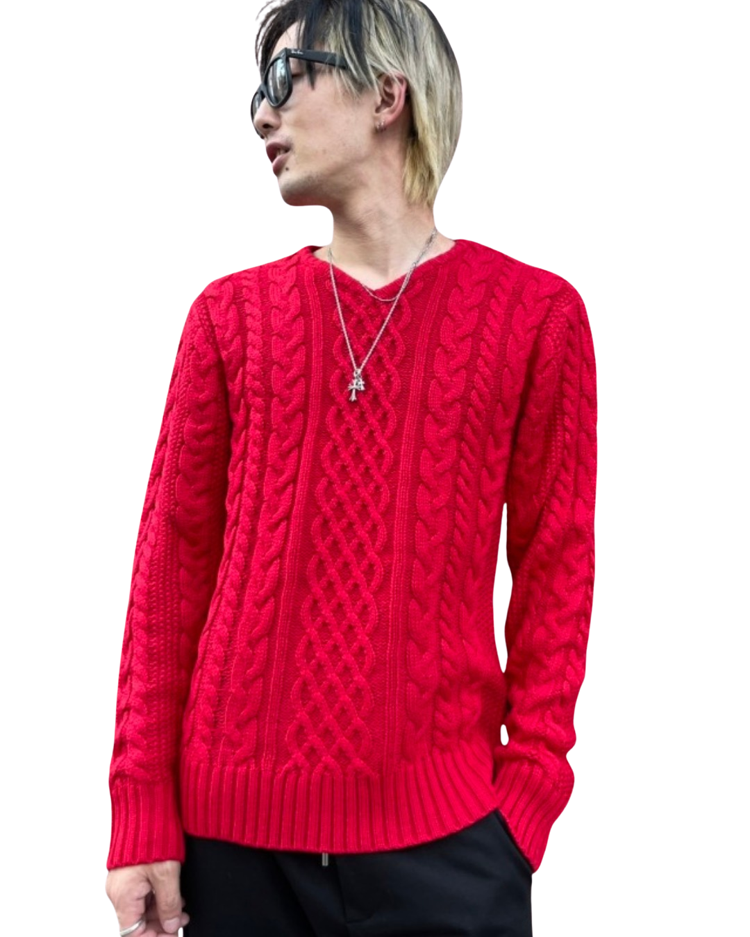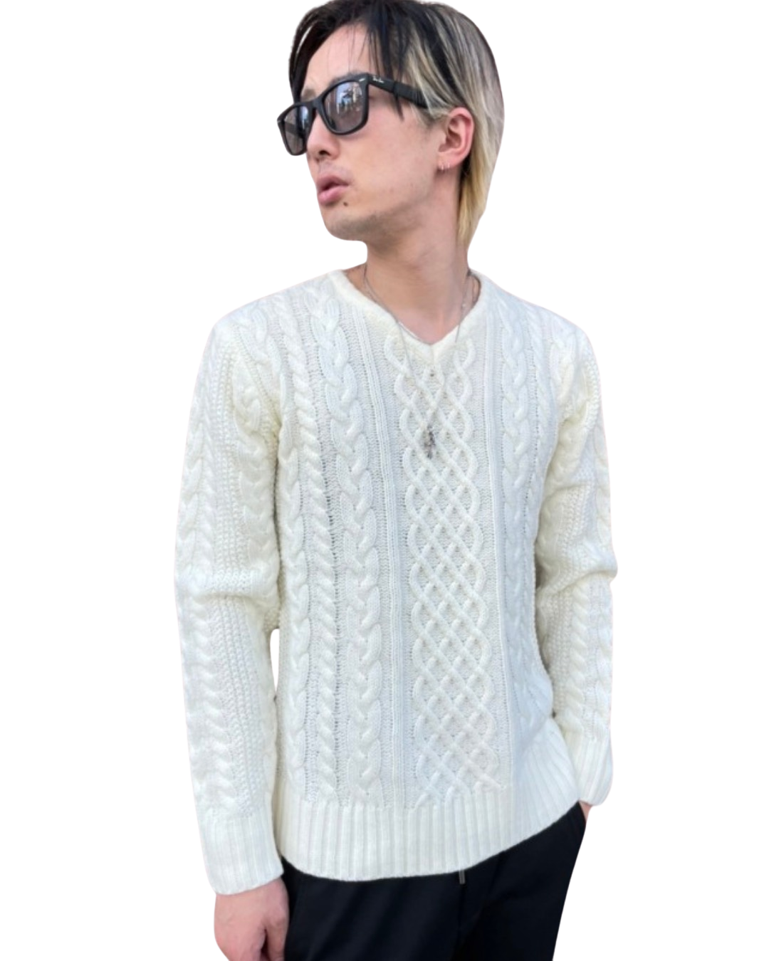 太い毛糸を使用し、ざっくりと編まれたニット。厚手で柔らかく、最高の着心地に仕上がりました。三つ編みの様な柄が大胆にも縦に施されているので、立体感を生み、1枚でもばっちり決まります。シャツやカットソーをインナーに合わせたレイヤードスタイルでも、アウターのインナーとしての着用も◎カラーの違いで雰囲気も変わるので、何枚持っていても困らないアイテム。メンズ、レディース共におすすめできるユニセックス商品です。