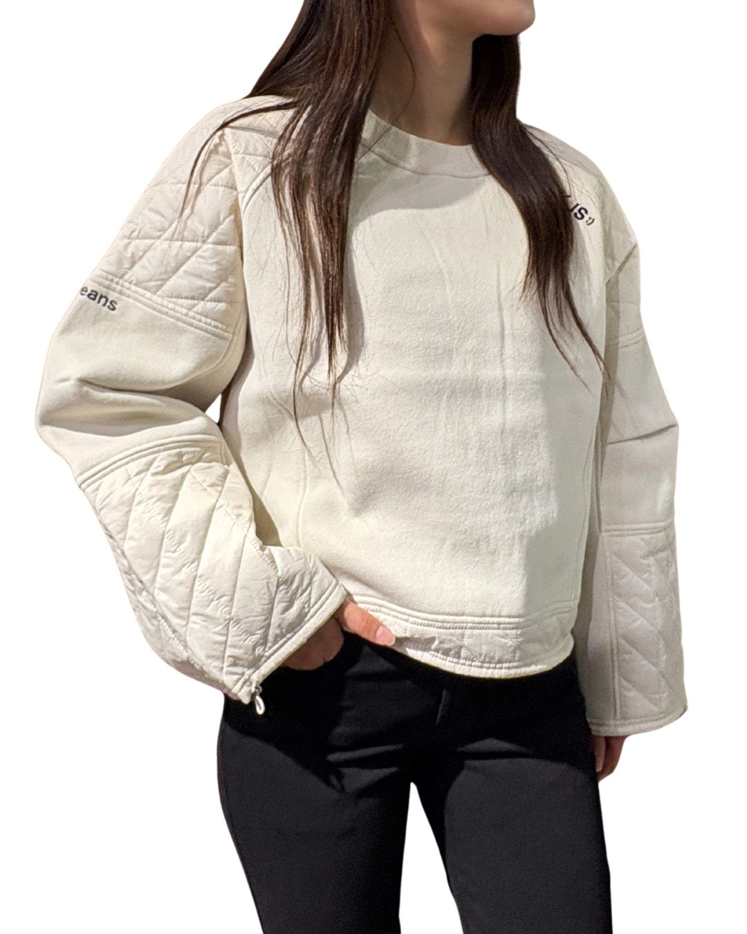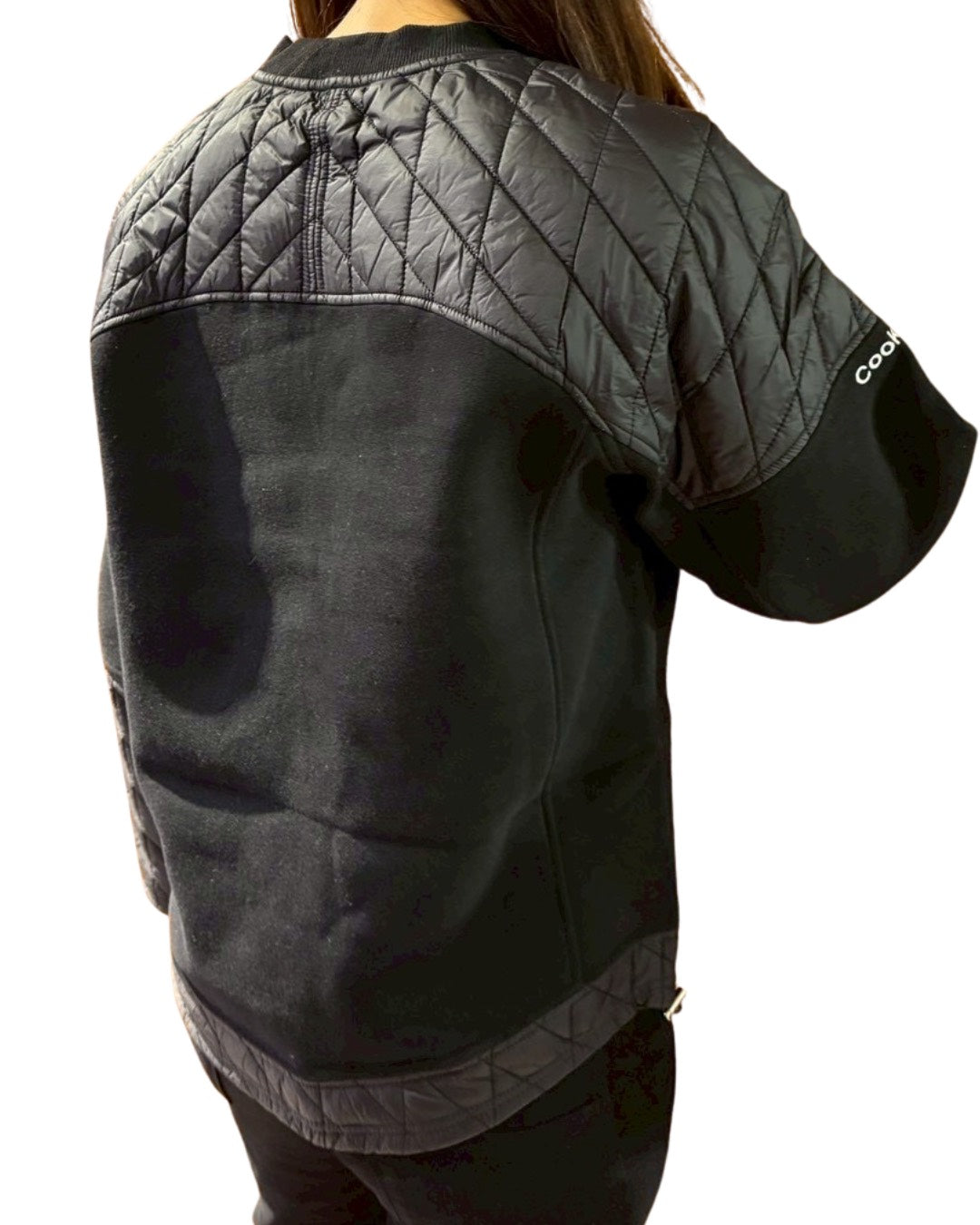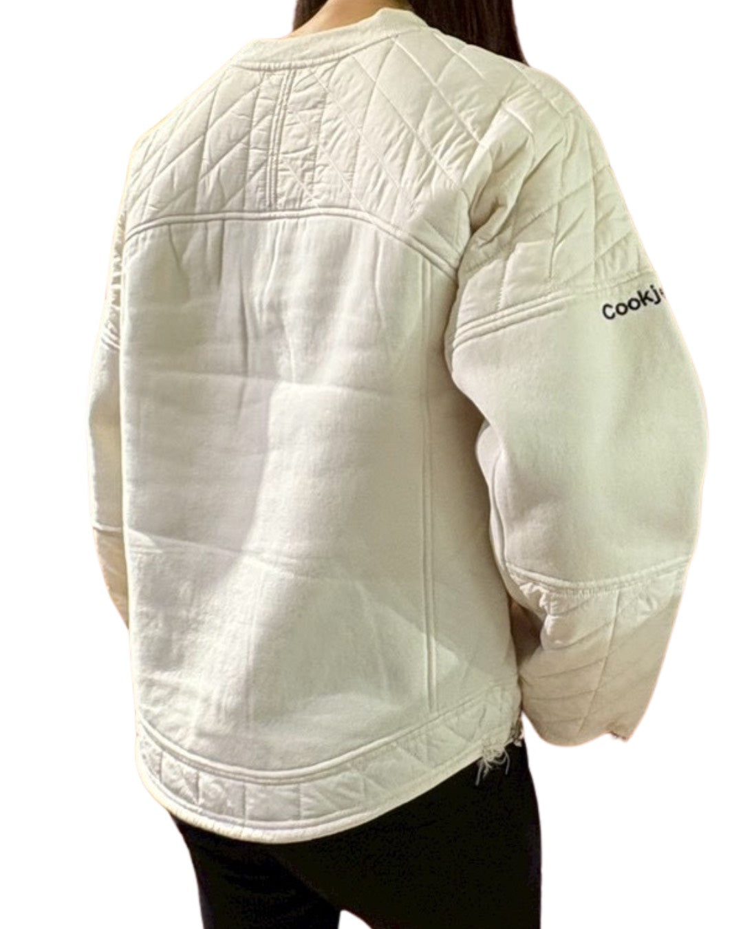 カットソーキルティングと中綿の暖かいプルオーバー。ベーシックなブラックとオフの2色展開で登場。コットンならではの柔らかな肌触りがありつつ、保湿性も申し分なし。異なった生地の切替やプリントではなく糸で編み込んだオリジナルロゴをあしらうなど、細部にも拘りました。冬のアウトドアに最適で、ユニセックスで楽しめます。使いまわししやすい一枚を是非。
