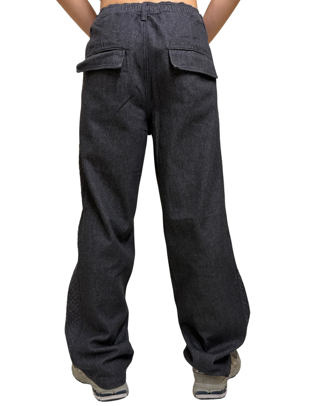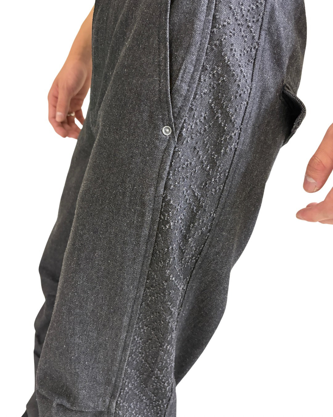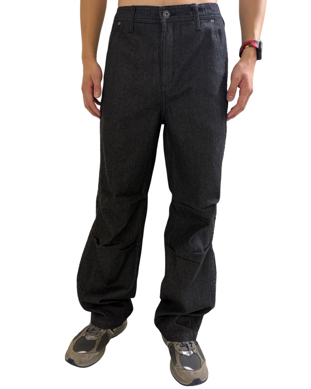 サイドに「那智の滝」の水しぶきを表現したレーザーダメージ加工を施したパンツ。ウエスト部分は背面がゴム、前面はベルトループがついているので緩めにも穿いていただけます。膝にはタックが入っているので動きやすさも重視しました。