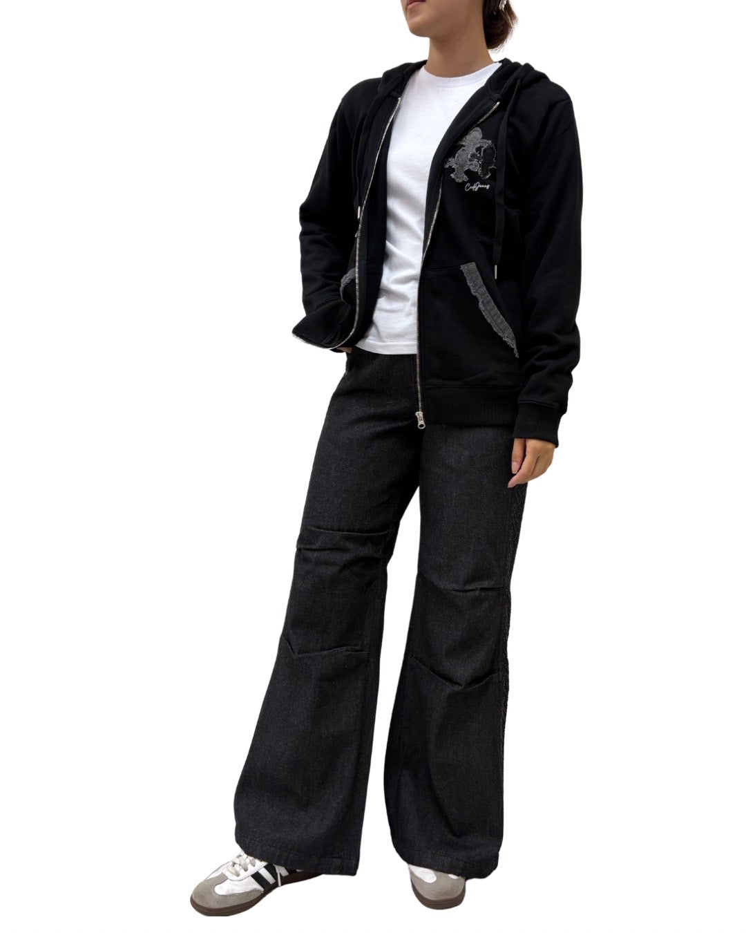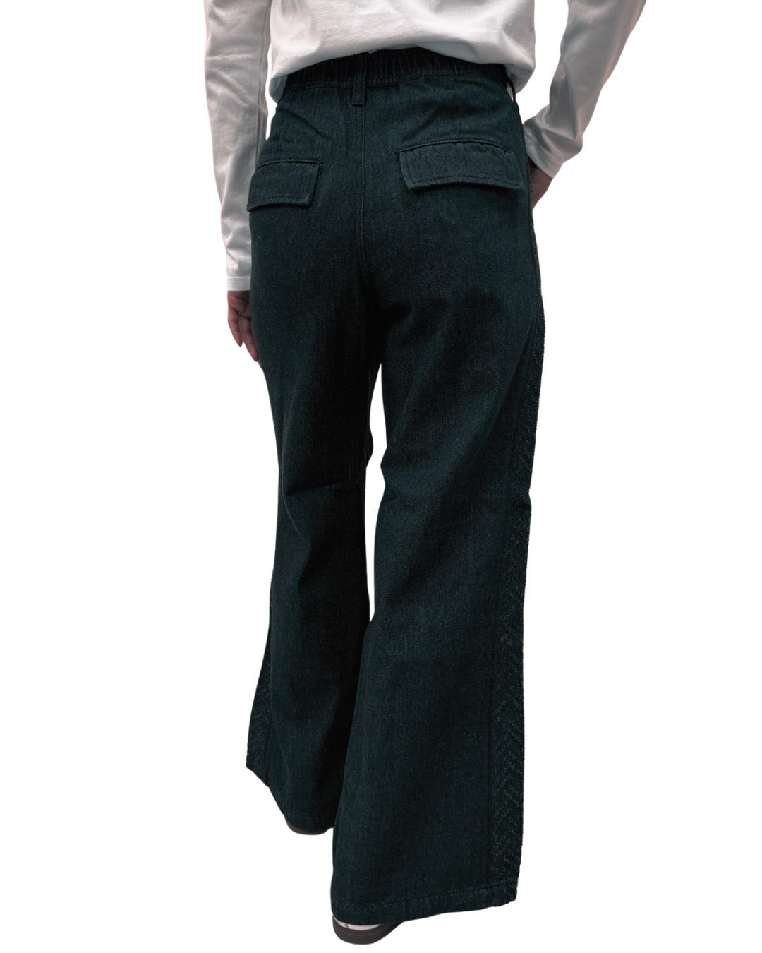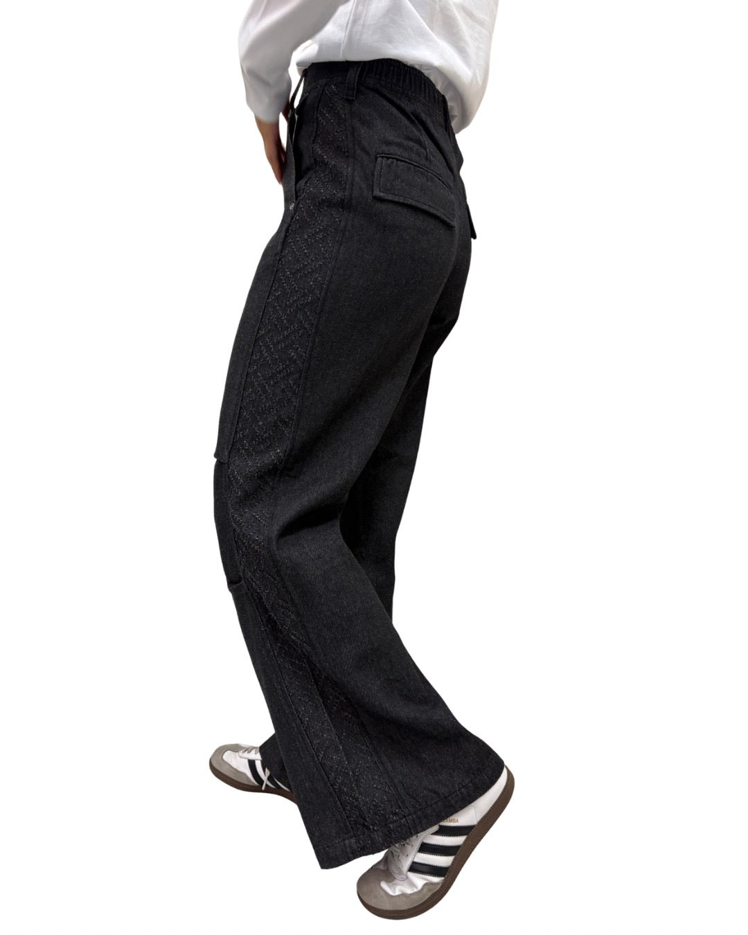 サイドに「那智の滝」の水しぶきを表現したレーザーダメージ加工を施したパンツ。ウエスト部分は背面がゴム、前面はベルトループがついているので緩めにも穿いていただけます。膝にはタックが入っているので動きやすさも重視しました。