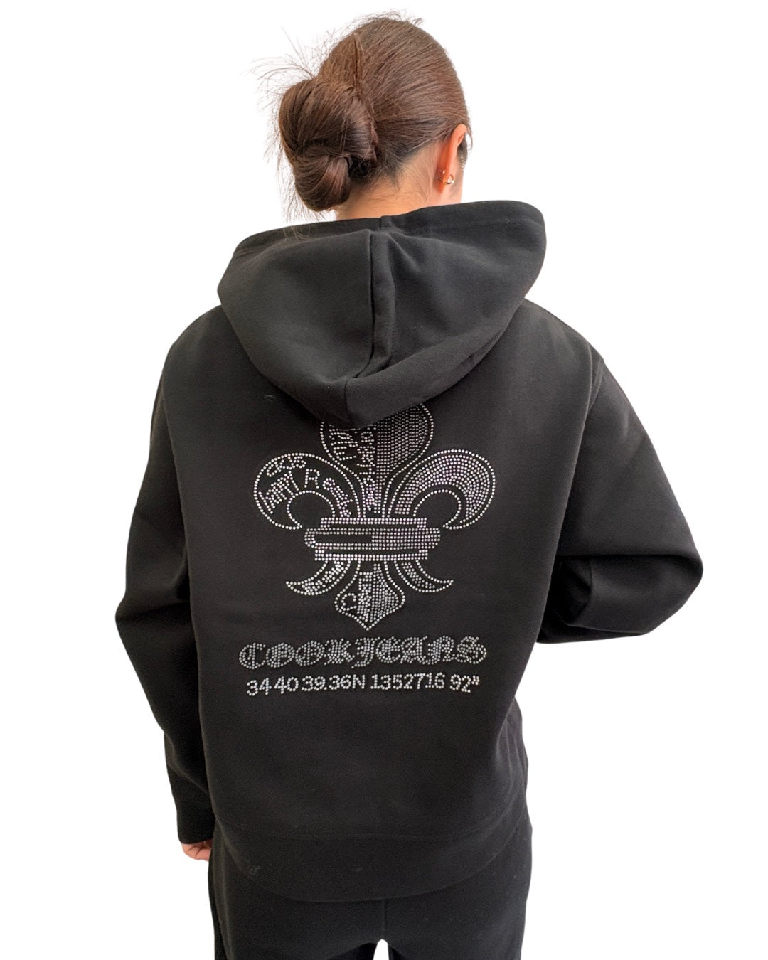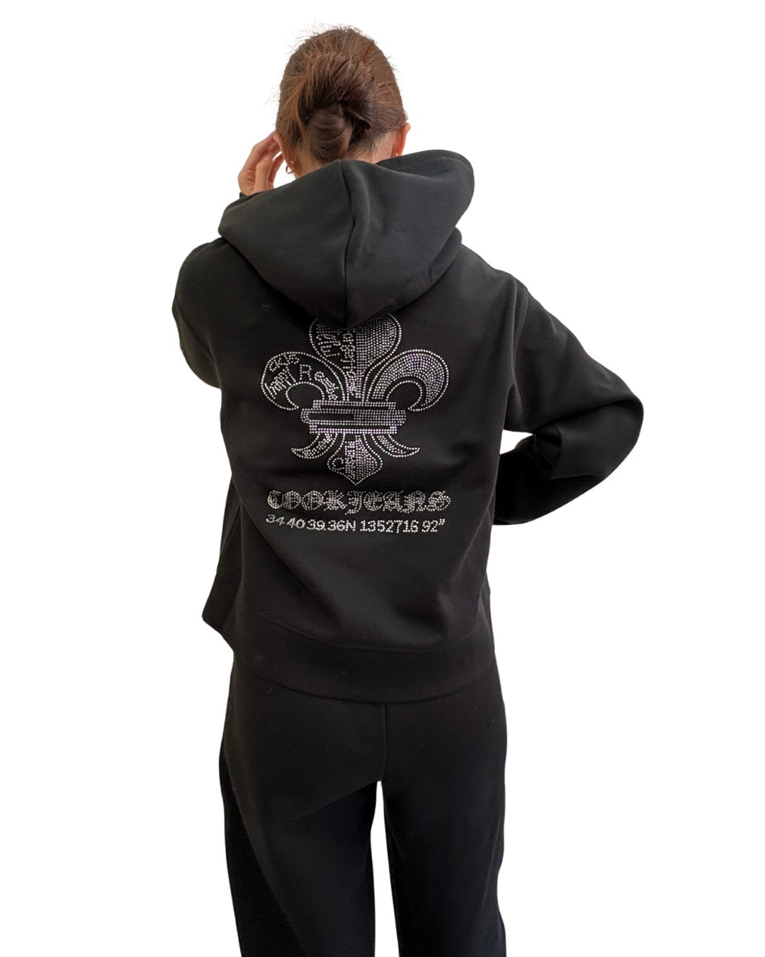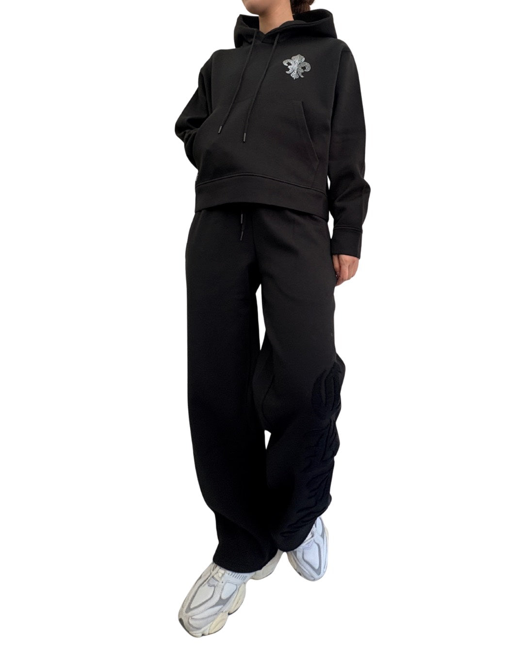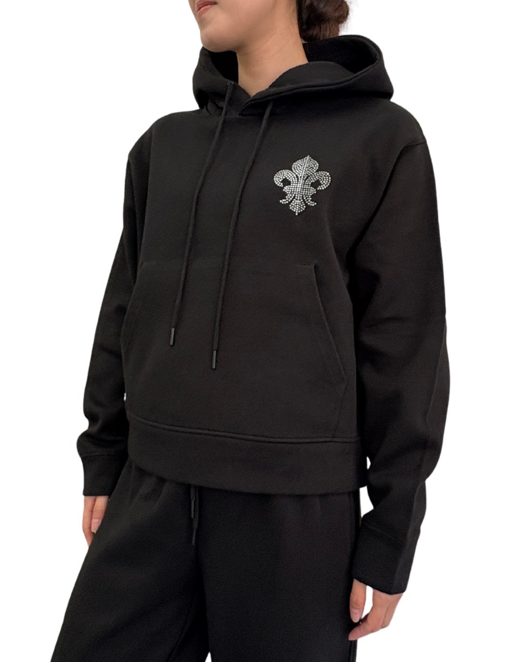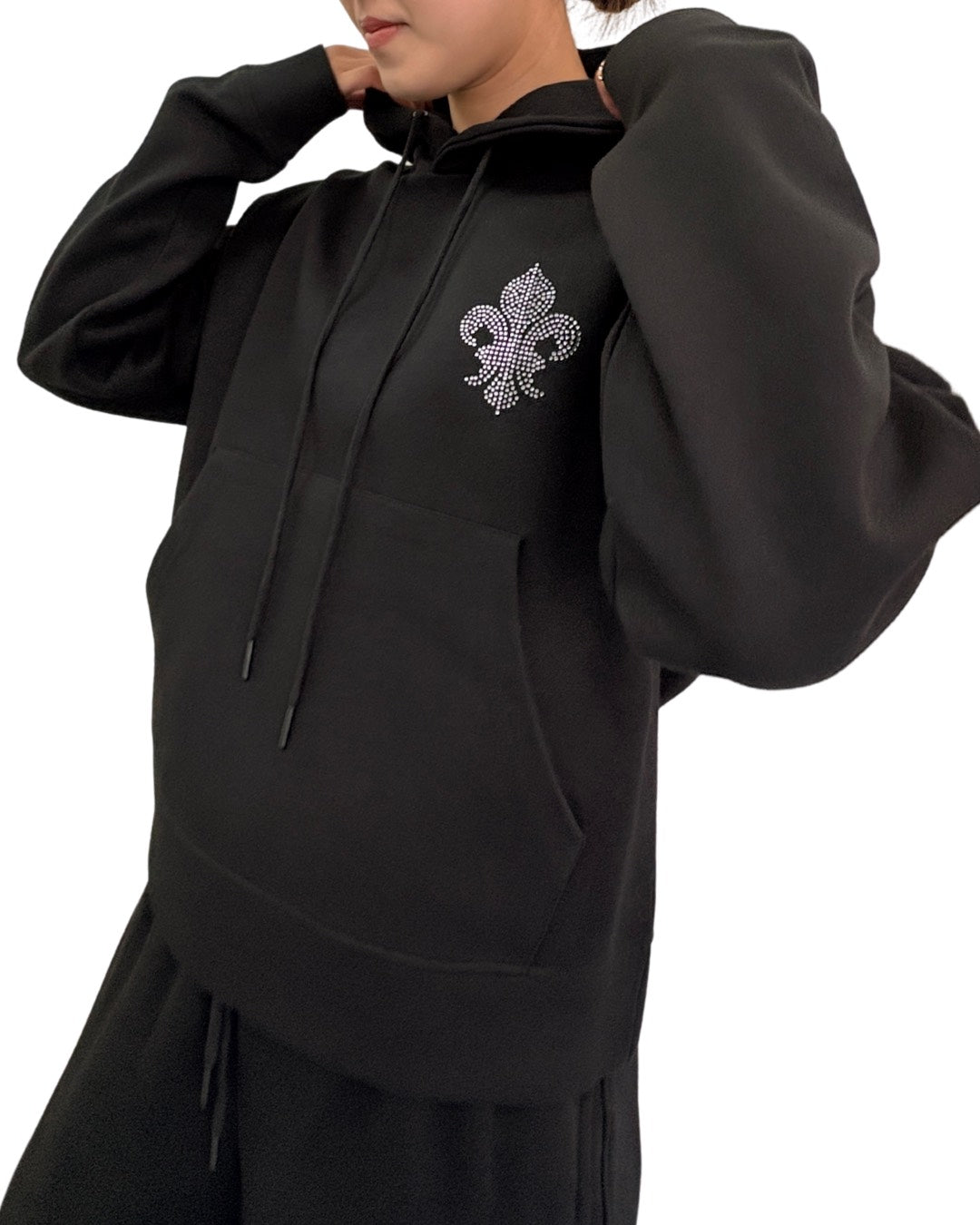 煌めくストーンで表現したダガーモチーフが印象的なプルオーバーパーカー。フロントは控えめなワンポイント、バックには存在感のあるデザインを配置し、シンプルながらも後ろ姿で差がつく一枚です。程よくゆとりのあるシルエットで、リラックス感がありながらも上品な印象。同素材のパンツと合わせたセットアップスタイルはもちろん、デニムとも相性が良く、幅広いコーディネートに対応します。デイリー使いからちょっとした外出まで活躍するアイテムです。
